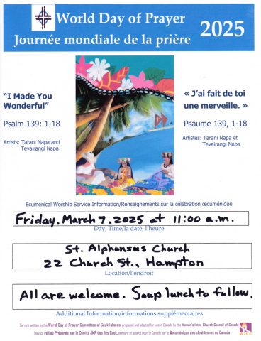 The annual women's day of prayer in the Hampton area will be hosted by the St. Alphonsus church this year. The theme is "I Made You Wonderful" and Psalm 139:1-18.